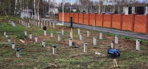 С помощью измерительной ленты и уровня отметьте место каждой будущей сваи. Расстояние между сваями обычно составляет2‑2,5м, но может уменьшаться при высокой нагрузке или ветровой нагрузке.